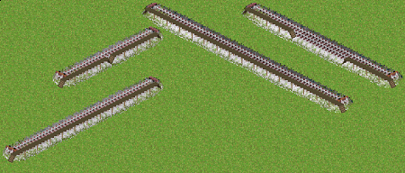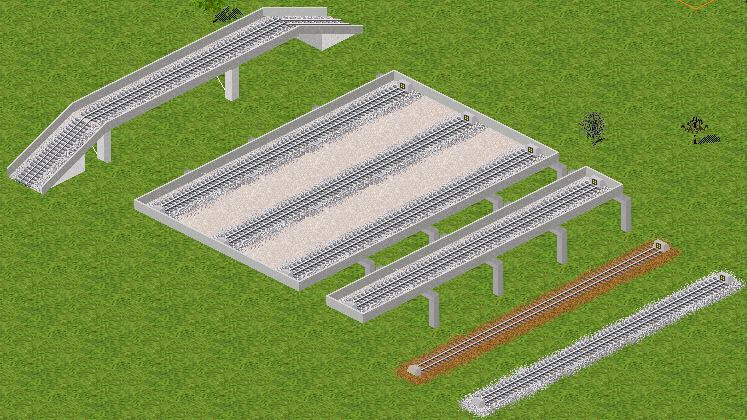 | 道路と市電軌道をうまく使って(※)、マップを回転しても側壁や分岐の見た目が崩れないようにした線路です。 画像は598氏の軌道セットに手を加えたものを使用しています。 ※なのでゲームシステム的には track ではなく road と tram track です。 2013/08/17 高架のグラフィックを修正しました (差し替えなくても見た目以外には支障ありません) 2014/09/15 緩急坂対応版を作りましたが、そちらはかなり新しいSimutransでしか動かないのでこの旧版も残しておきます。 | ||