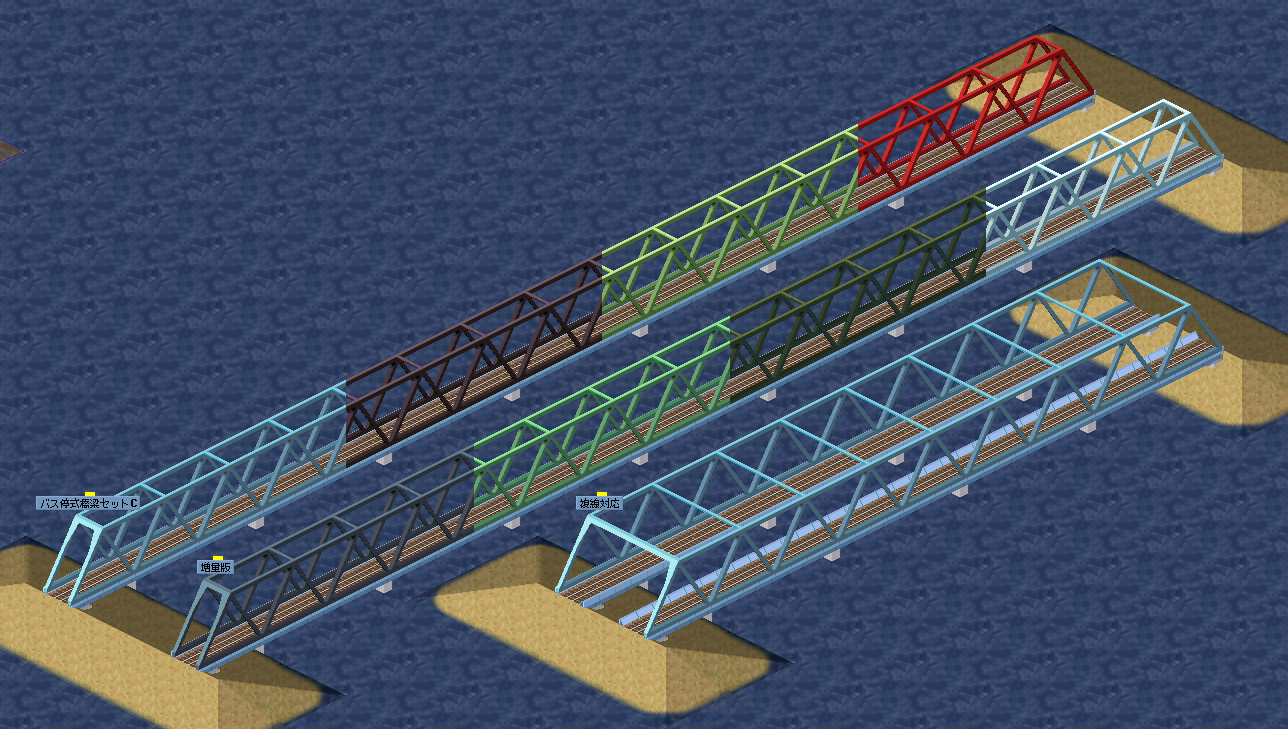 | 橋の見た目をしたバス停or駅を並べて設置していく建設方法をとった、リアルな橋梁再現セットです。 改造、二次配布は自由です。使用方法についてはreadmeをご参照ください。 2016/03/17 v1.1.0 細かな修正、色違い2種追加 2016/03/23 色違い増量版公開 | ||