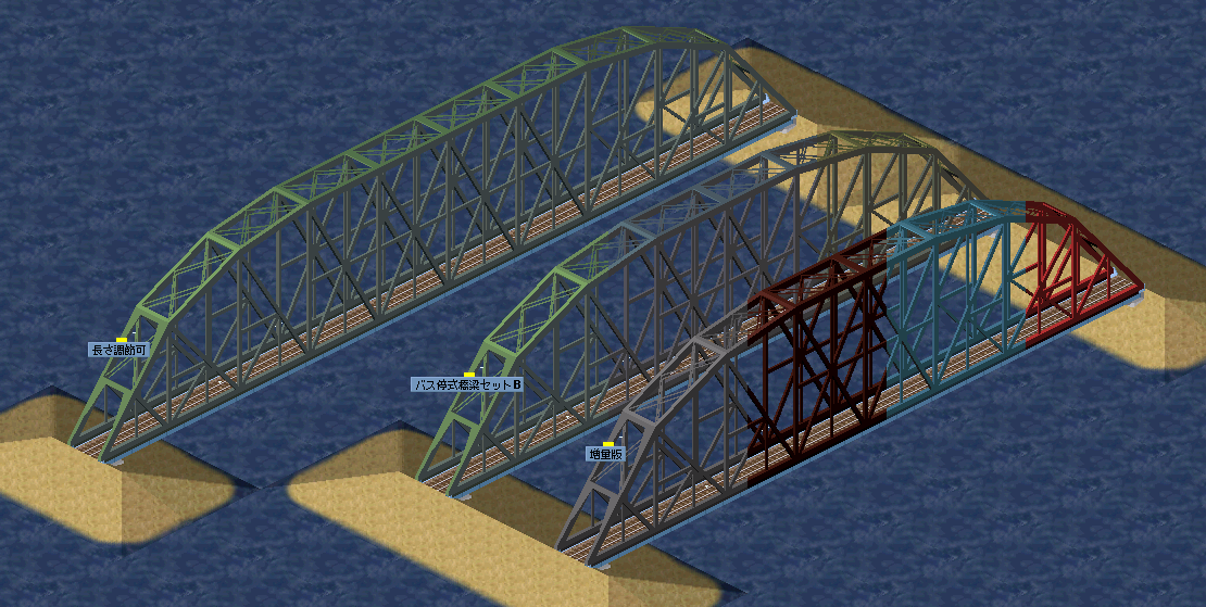 | 橋の見た目をしたバス停or駅を並べて設置していく建設方法をとった、リアルな橋梁再現セットです。 改造、二次配布は自由です。使用方法についてはreadmeをご参照ください。 2016/03/23 色違い増量版公開 | ||