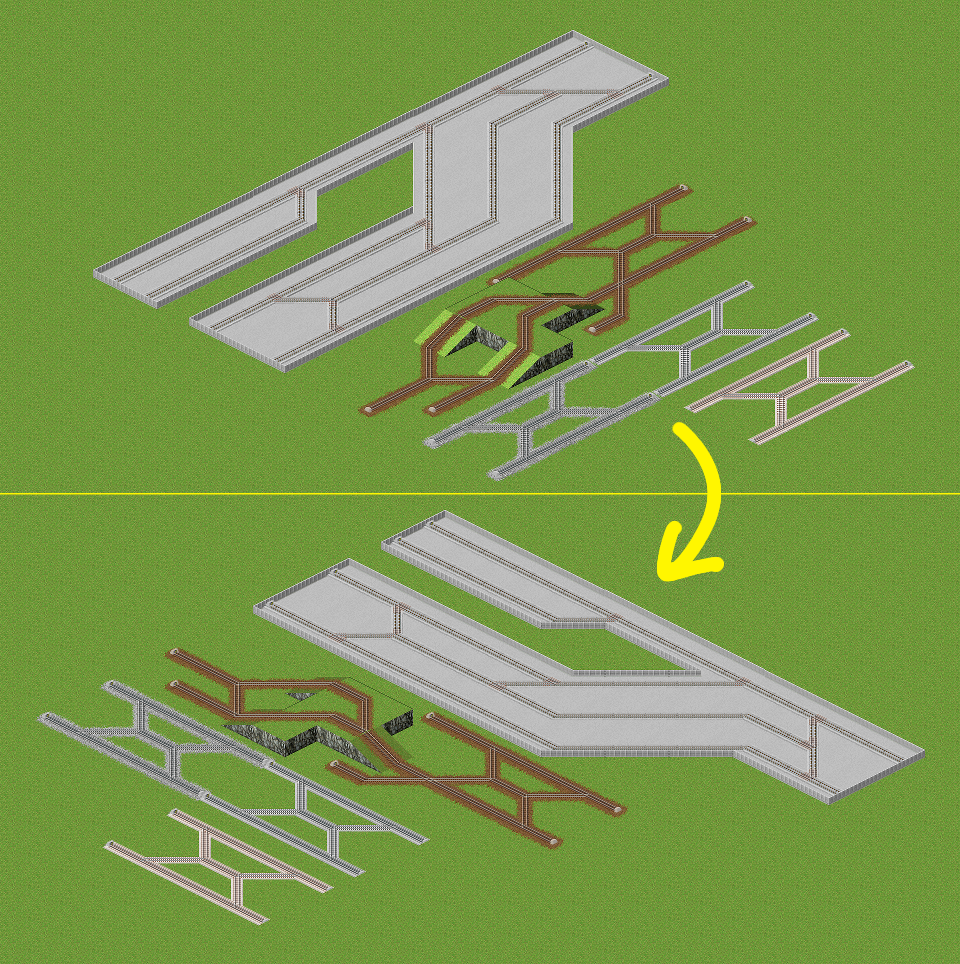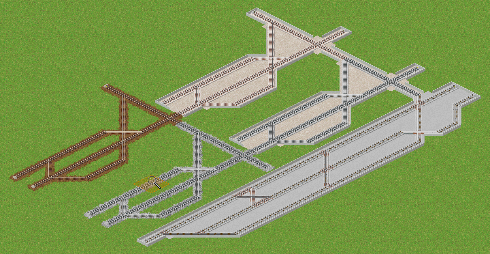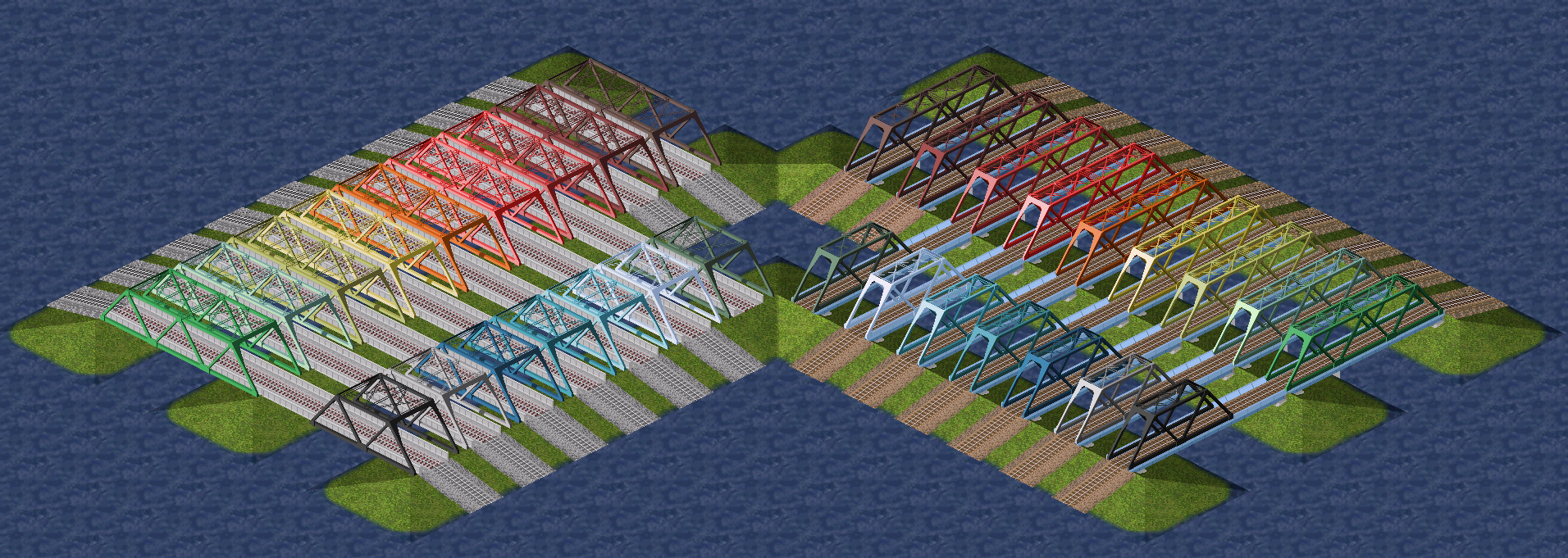 | 道路と市電軌道をうまく使って(※)、マップを回転しても側壁や分岐の見た目が崩れないようにした線路です。 画像は598氏の軌道セットに手を加えたものを使用しています。 ※なのでゲームシステム的には track ではなく road と tram track です。 2013/08/17 高架のグラフィックを修正しました (差し替えなくても見た目以外には支障ありません) 2014/09/15 緩急坂対応版を作りましたが、そちらはかなり新しいSimutransでしか動かないのでこの旧版も残しておきます。 | ||